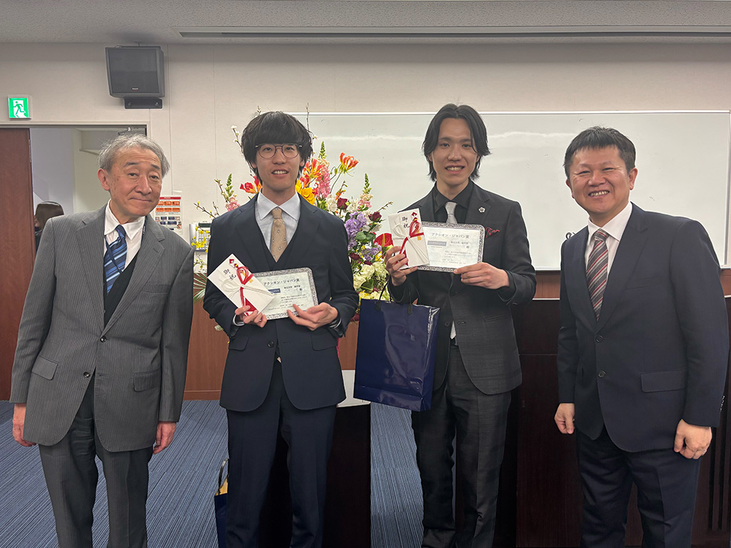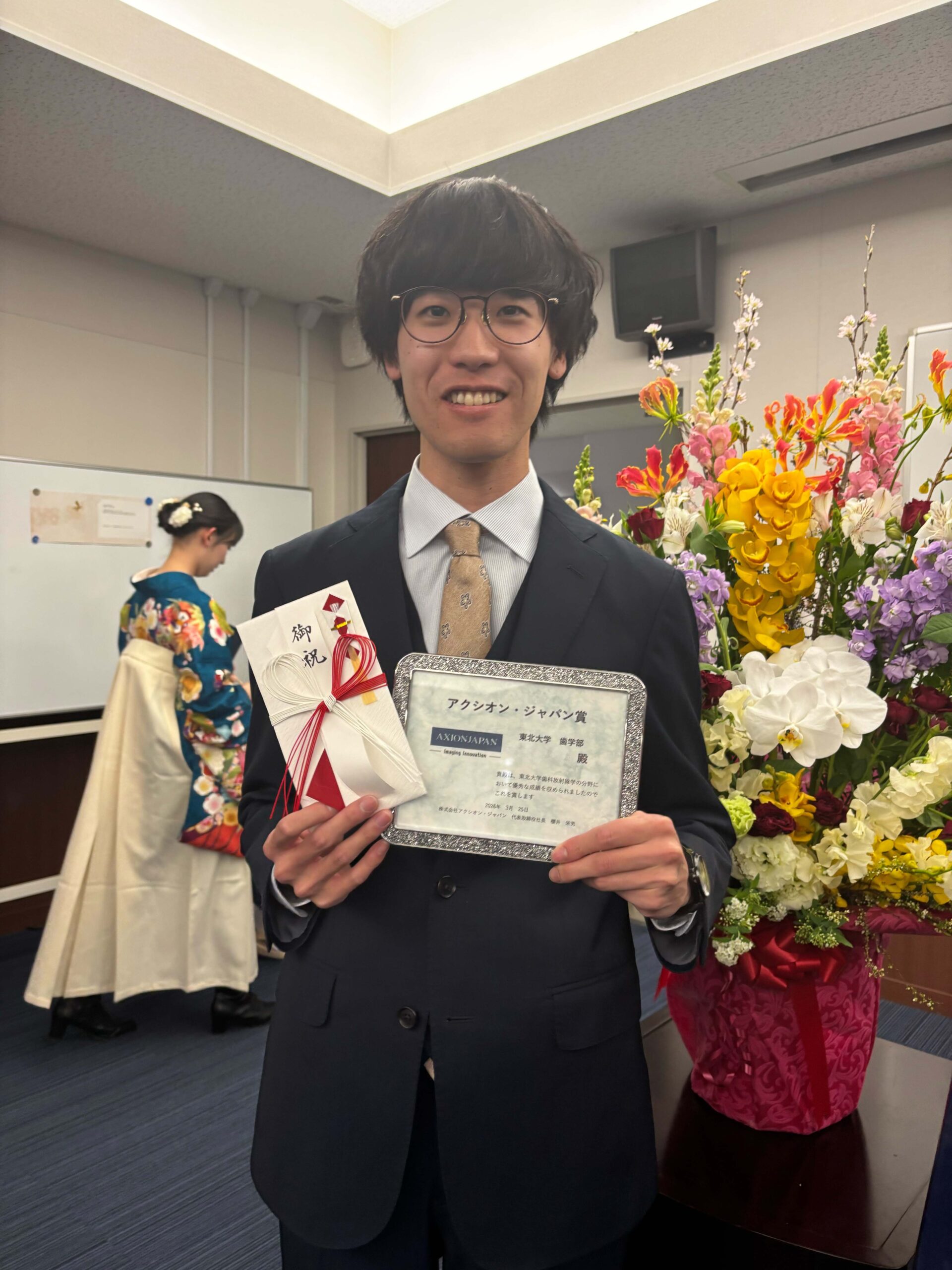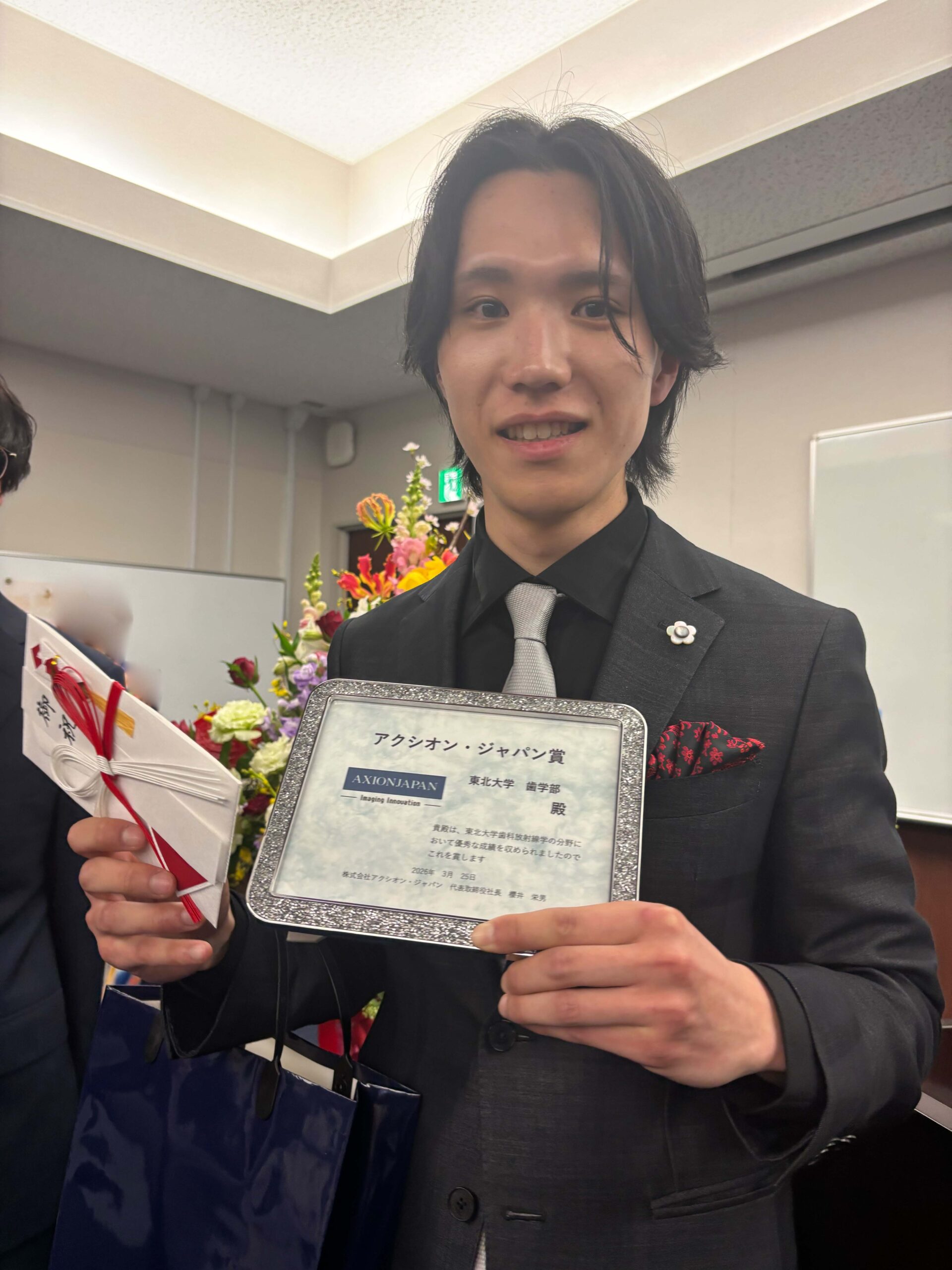 2025年度 東北大学 歯学部・歯学研究科学位記伝達式の中で、成績優秀者への各賞(総長賞等)の一つとして、歯科放射線学で優秀な成績を収めた学生さんに、社長自らアクシオン・ジャパン賞を授与いたしました。